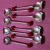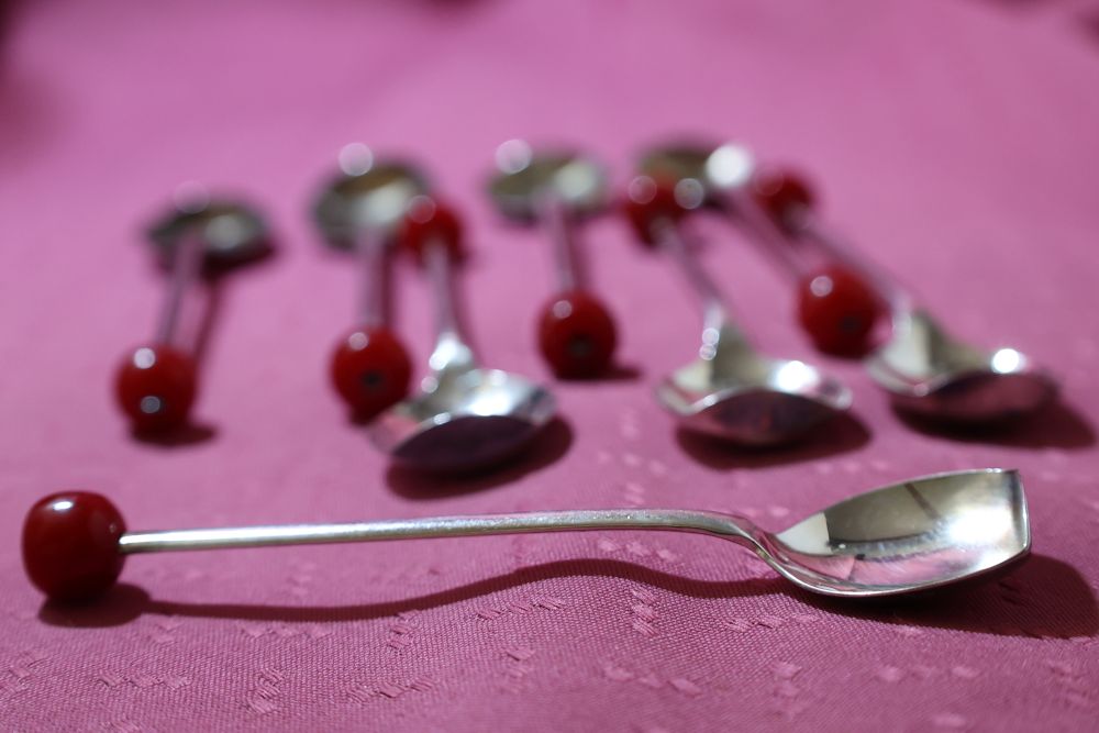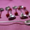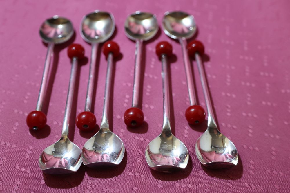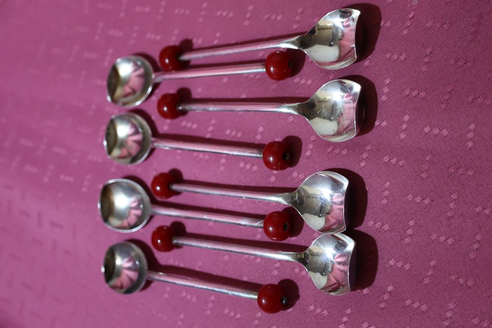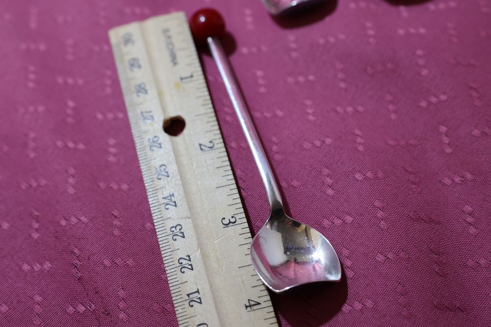 6 Sheffield Cocktail Muddler Spoons silver plate with red lucite/bakelite cherry ball finial.  Very popular in the 1920’s and 1930s when the drink “THE OLD FASHIONED” was so popular.