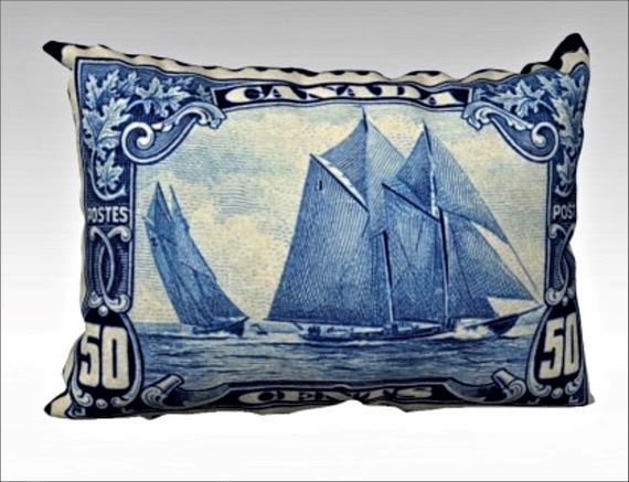 The Bluenose is an iconic Canadian symbol and graced one of Canada’s most collectible postage stamps back in the 1920s.  The most famous ship in Canadian history, the Bluenose was both a fishing and racing vessel in the 1920s and 1930s.  The image on this pillow cover comes from a postage stamp in my own collection.  The back panel is a solid black soft canvas.  The cover fits a 20×14 lumbar pillow form and is made from a soft yet sturdy canvas fabric giving a modern look to your décor.  100% polyester upholstery canvas; 50,000 double rub count for fabric durability. Printed with fade resistant solvent-free inks and the bottom features a YKK zipper closure.
