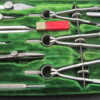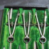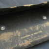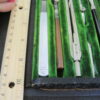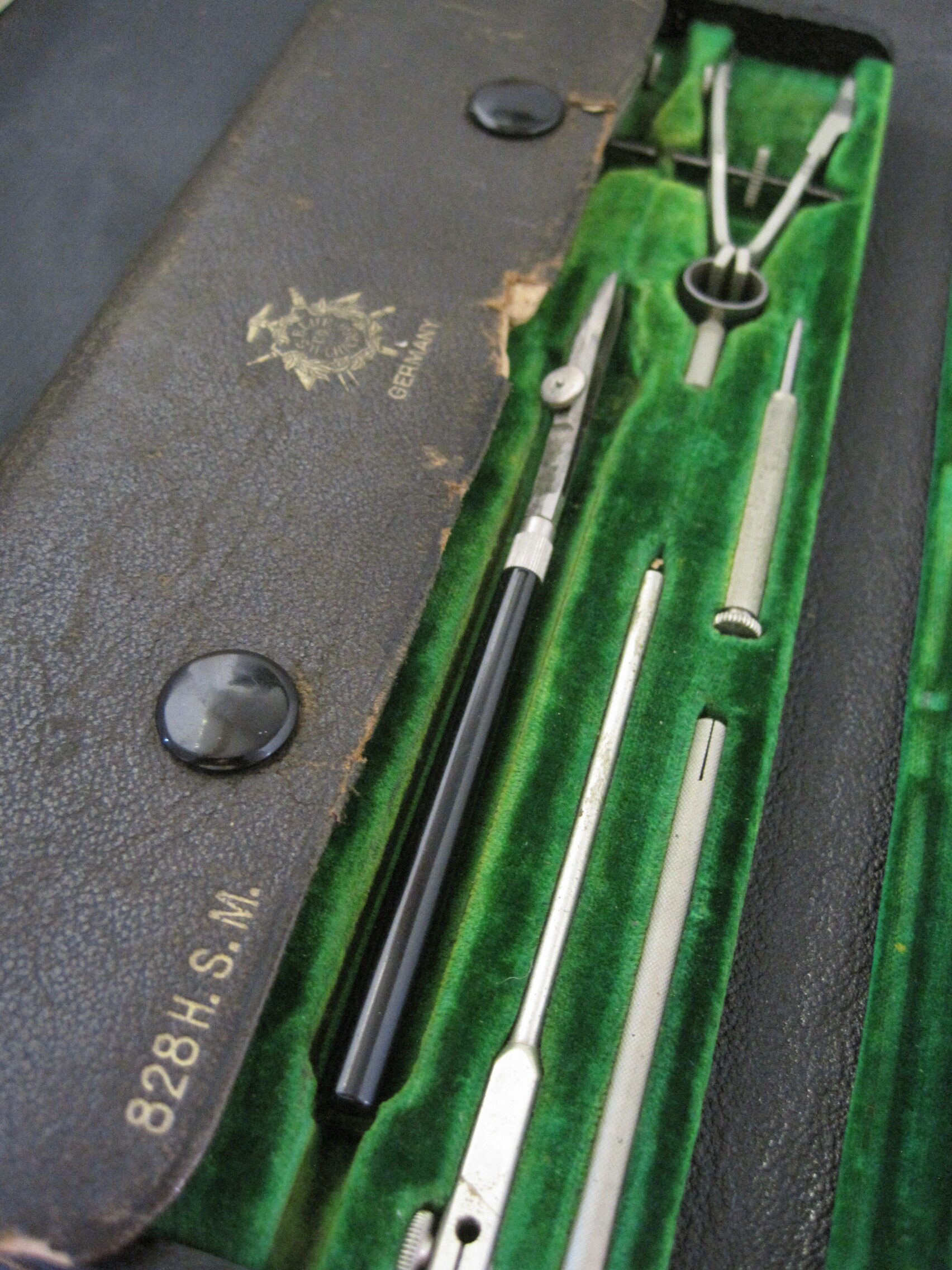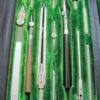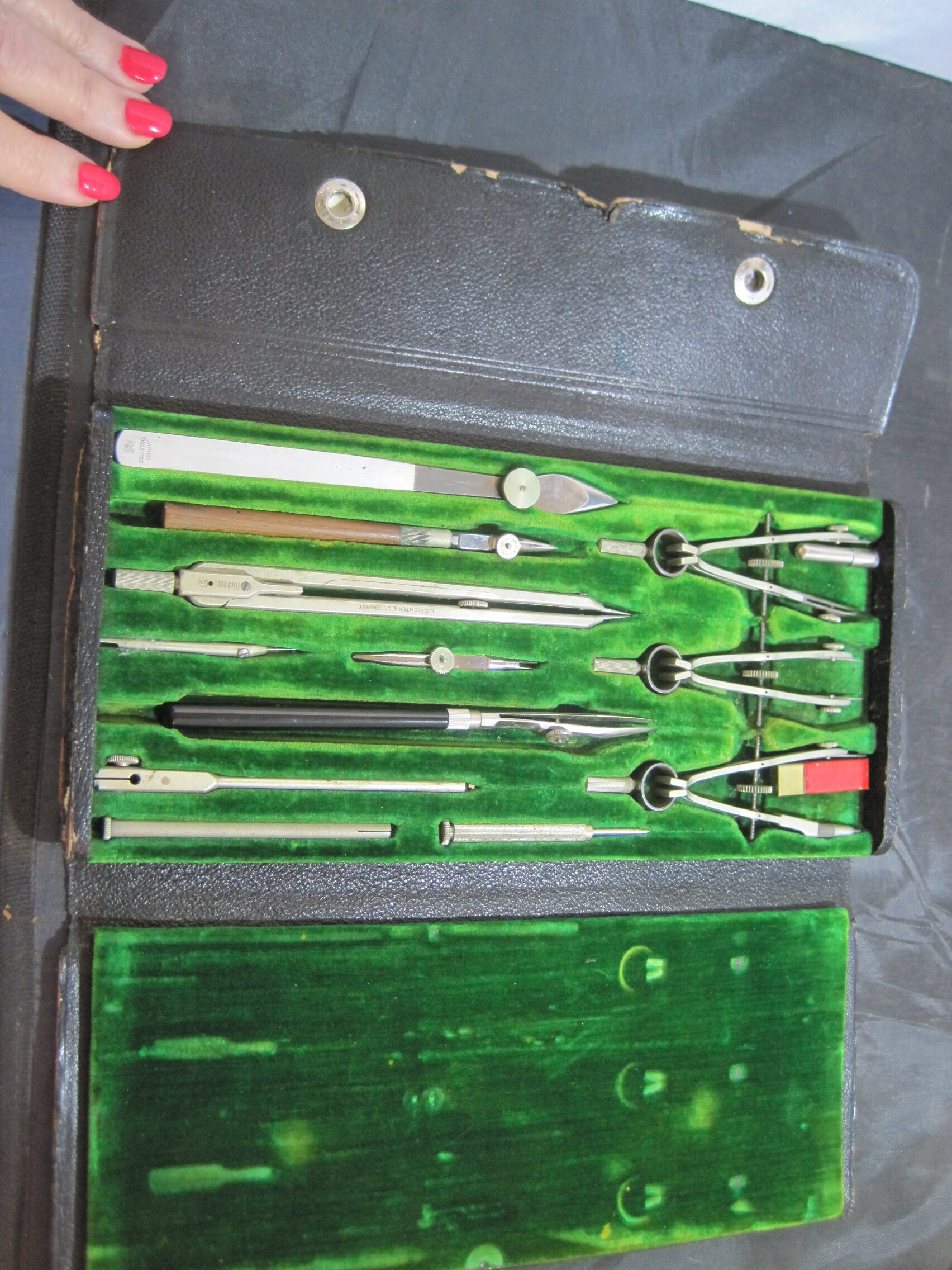 Drafting, Drawing Tools Set. This is in really good condition for its age. Leather bound cover is worn but the green velvet on the insides is in good condition – one tool is missing but a black handled replacement is in its place. Also included is a small wooden red pencil holder.