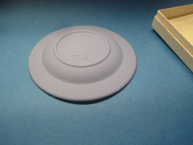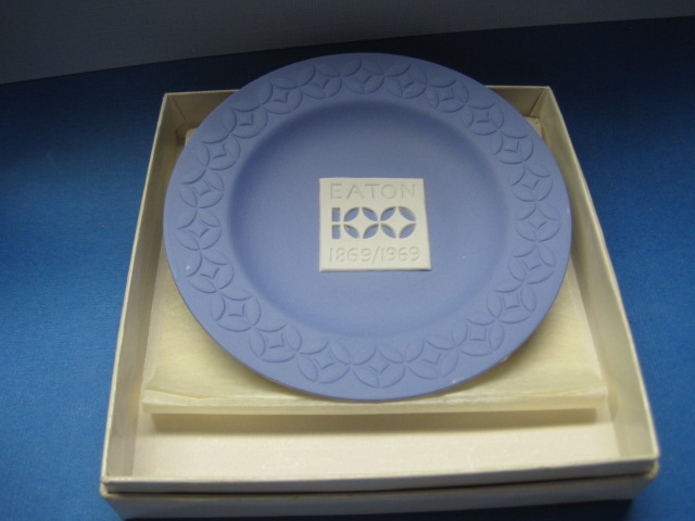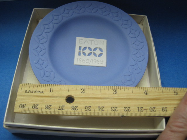 Blue Jasperware trinket plate produced by Wedgwood to celebrate the popular Canadian Department Store Eaton’s. No date mark but in original box that has some gentle wear.