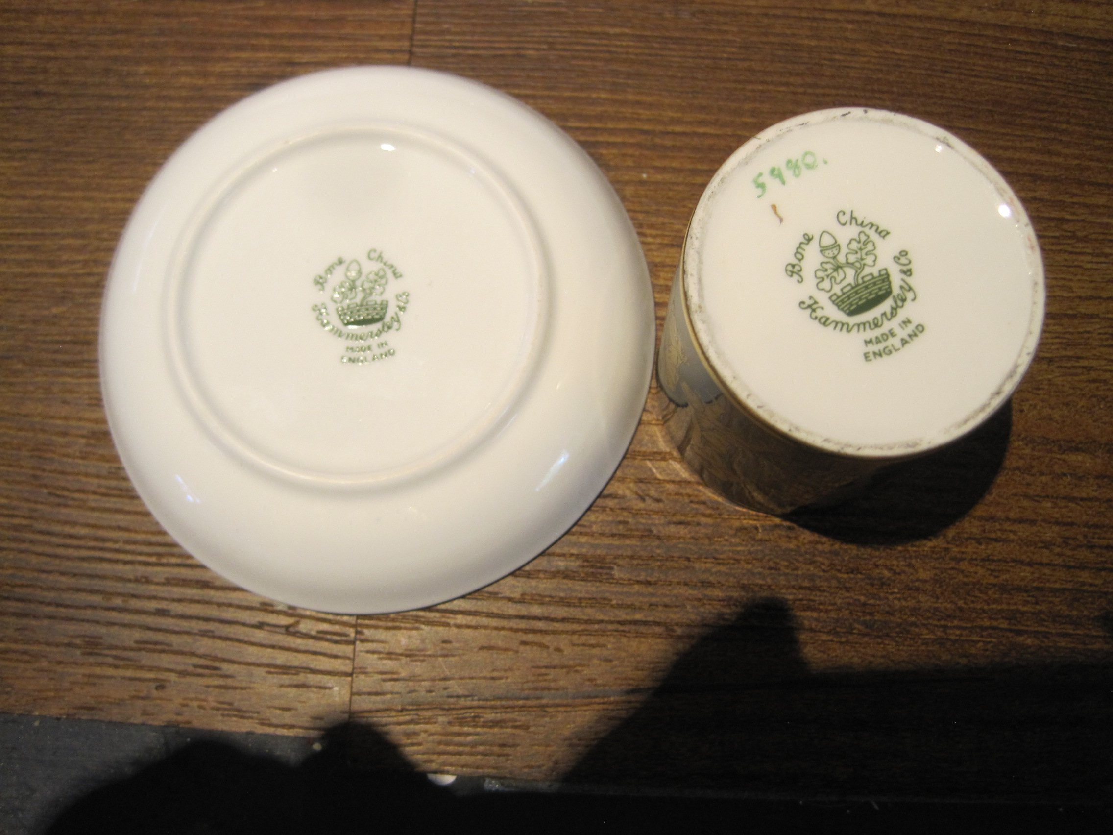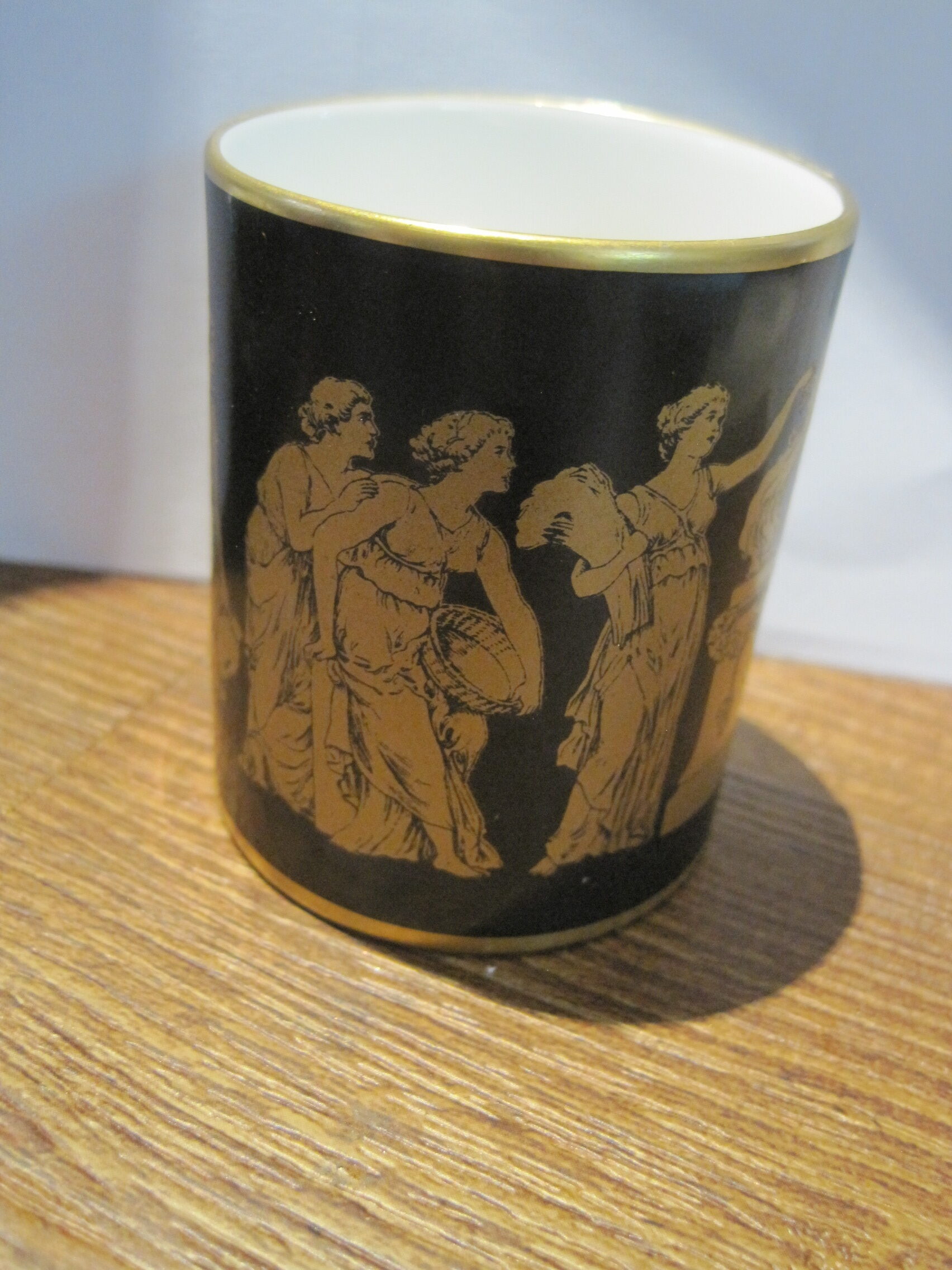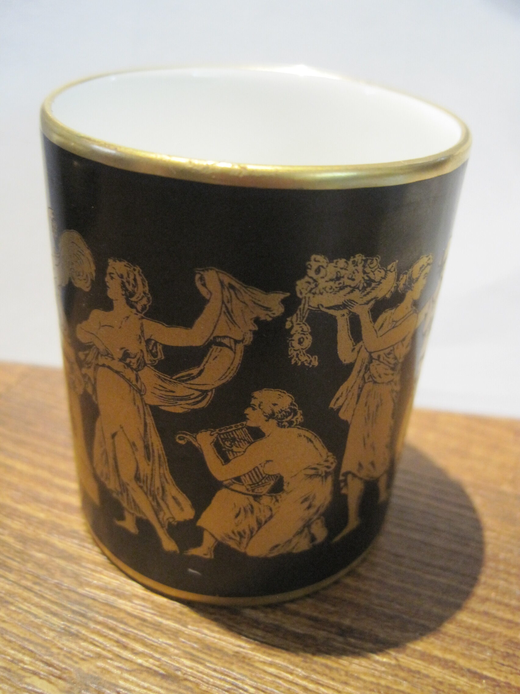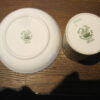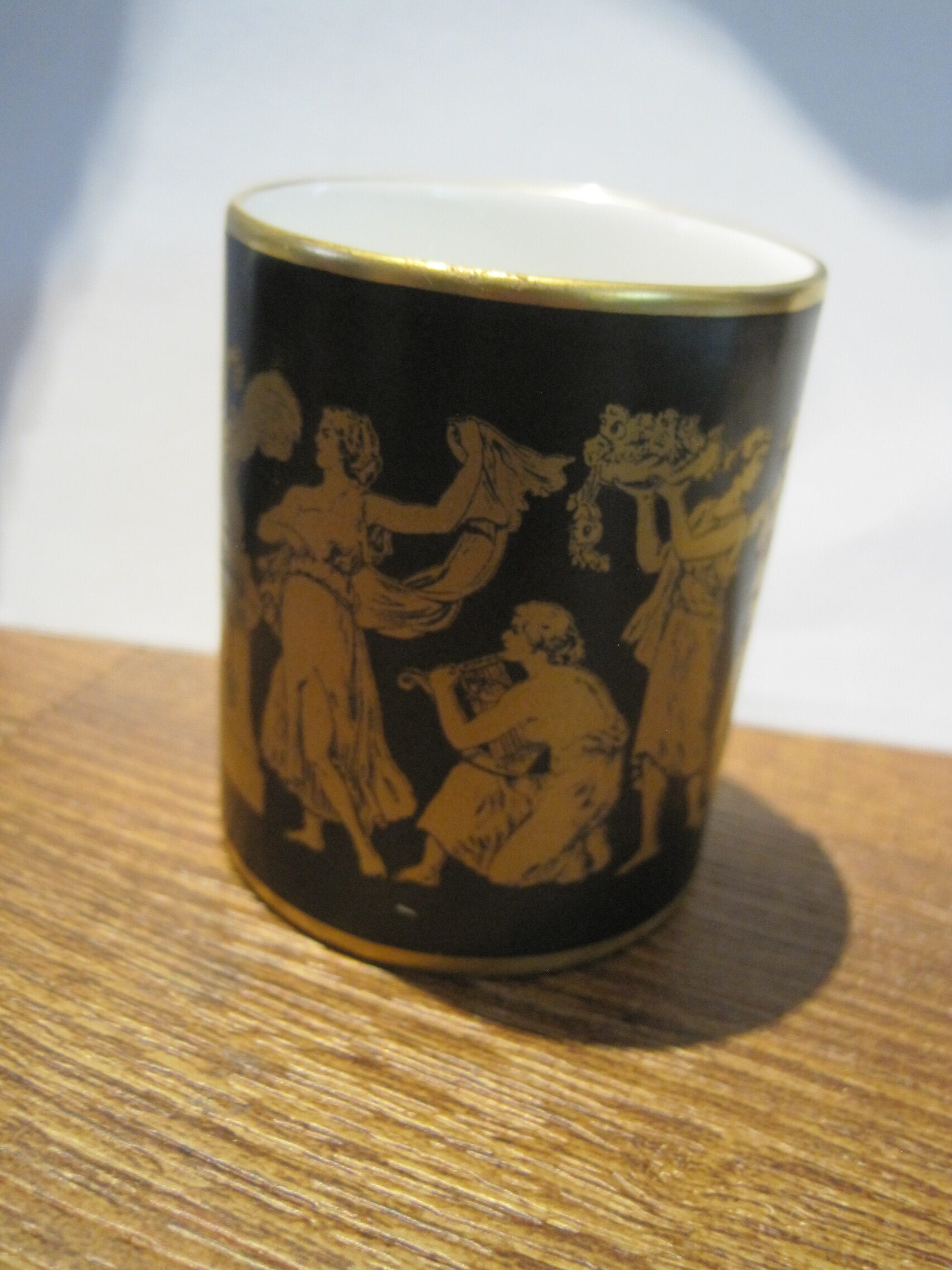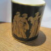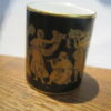 Rare – Hammersley Black and Gold 1930’s Smoking Set composed of a cigarette holder and ashtray.  Both pieces in excellent condition.  Black with hand painted gold Greek fresco design. Cigarette holder measures just under 2.5 inches in height. The ashtray is about 4 inches wide.