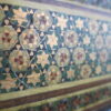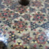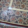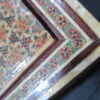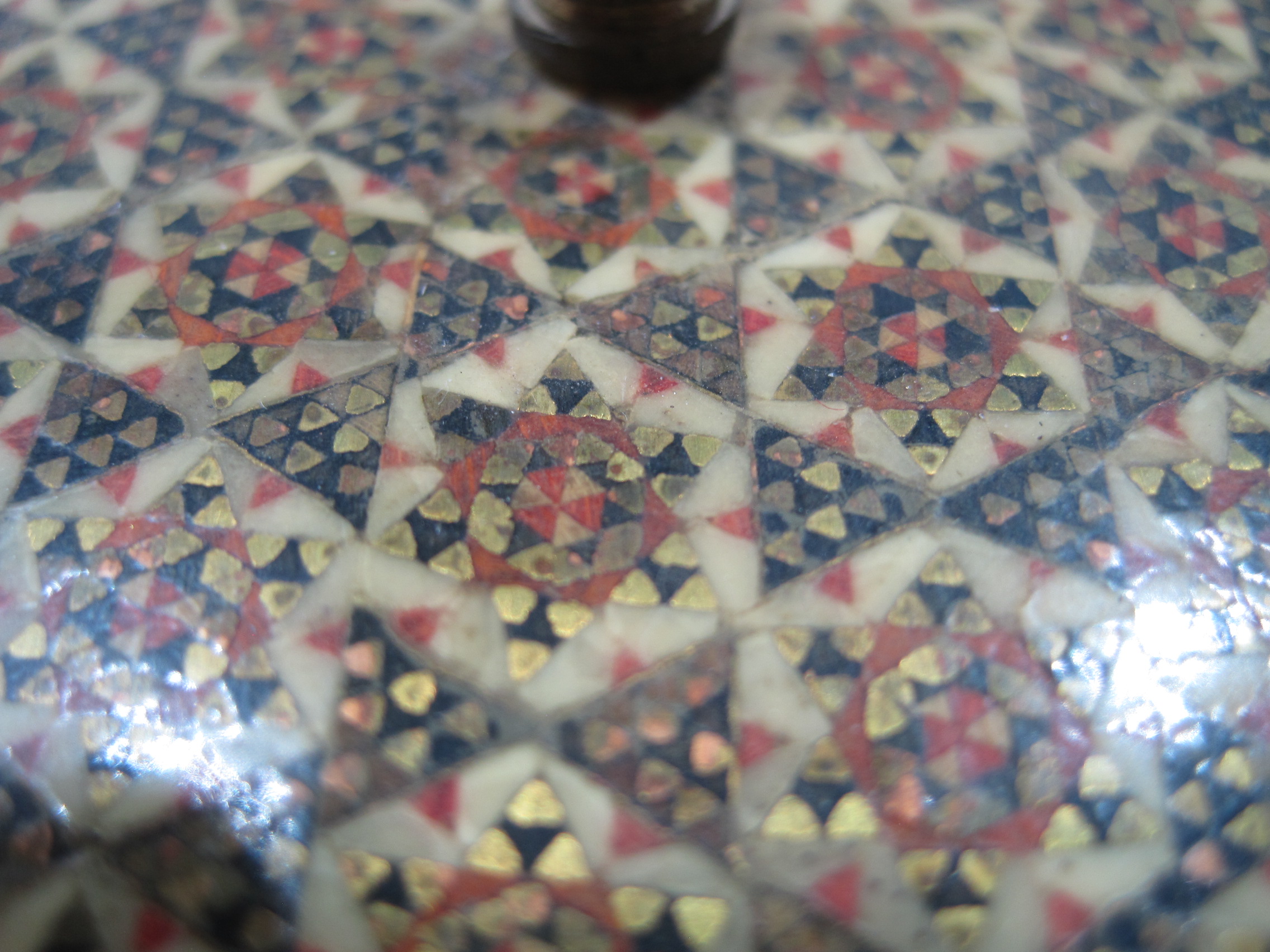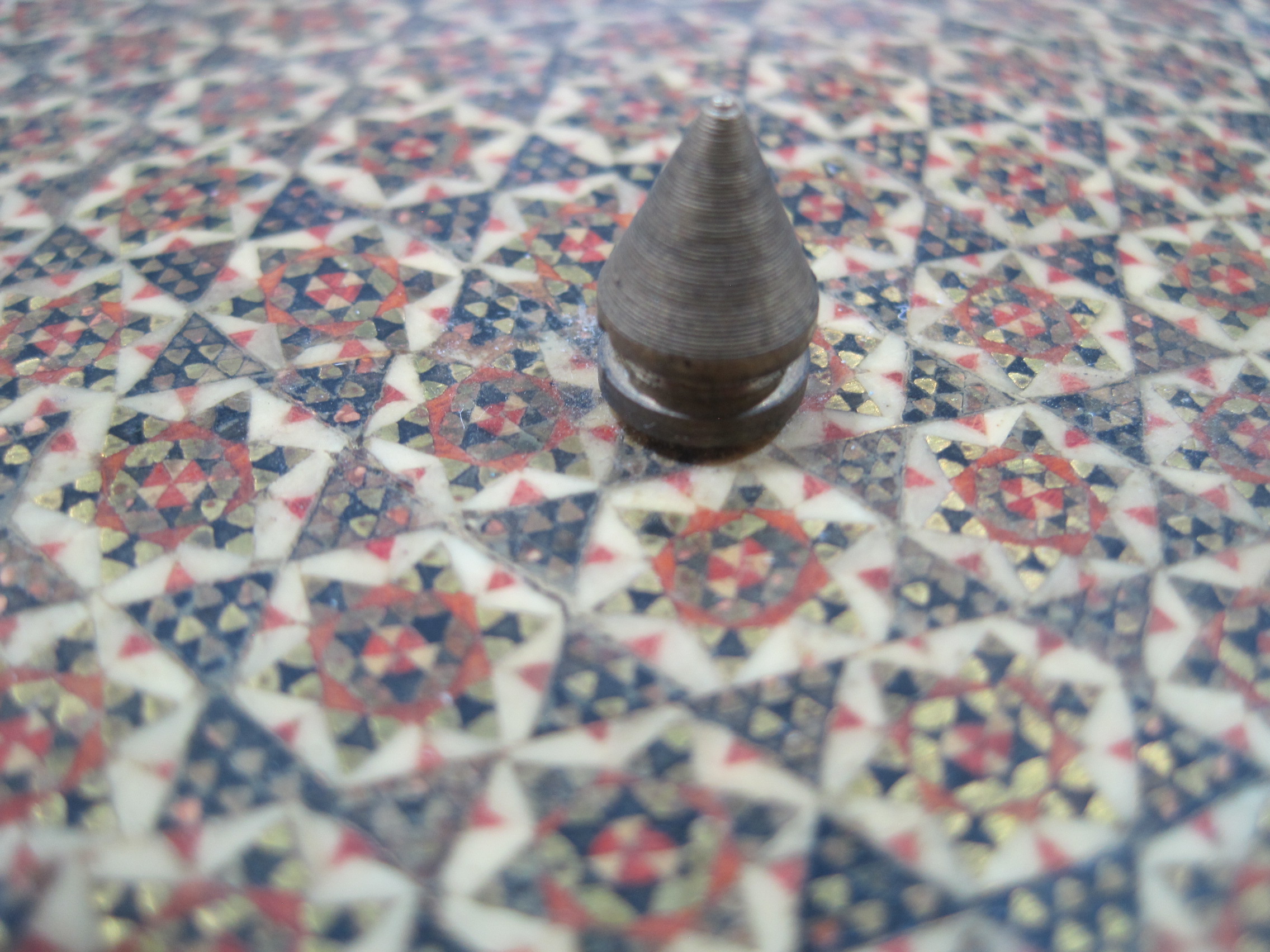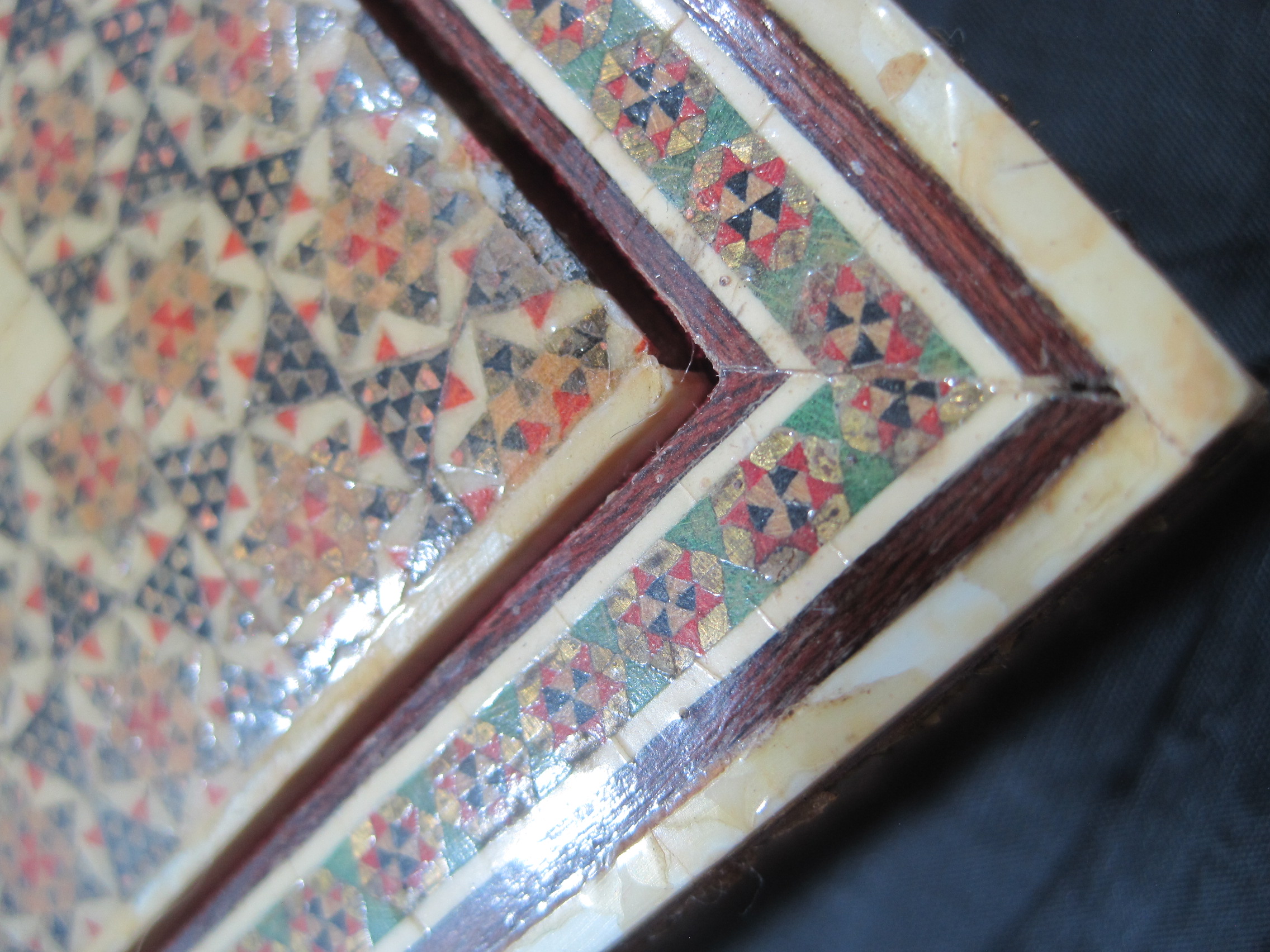 The look and patterning of khatam kari is directly linked to the technique used to create it. Thin rods of wood, bone, and metal are cut to roughly 2mm (or less) thick and 30cm long, then bound together, first with string and then with glue. The desired pattern becomes visible by looking at one end of the bundle, from which 1mm slices are cut. The slices are then arranged and adhered on the surface to be adorned. In the finished product, there may be upwards of 250 pieces to each cubic centimeter!”