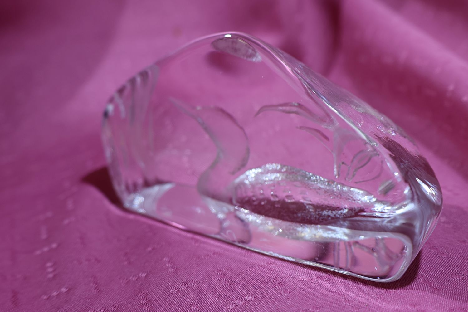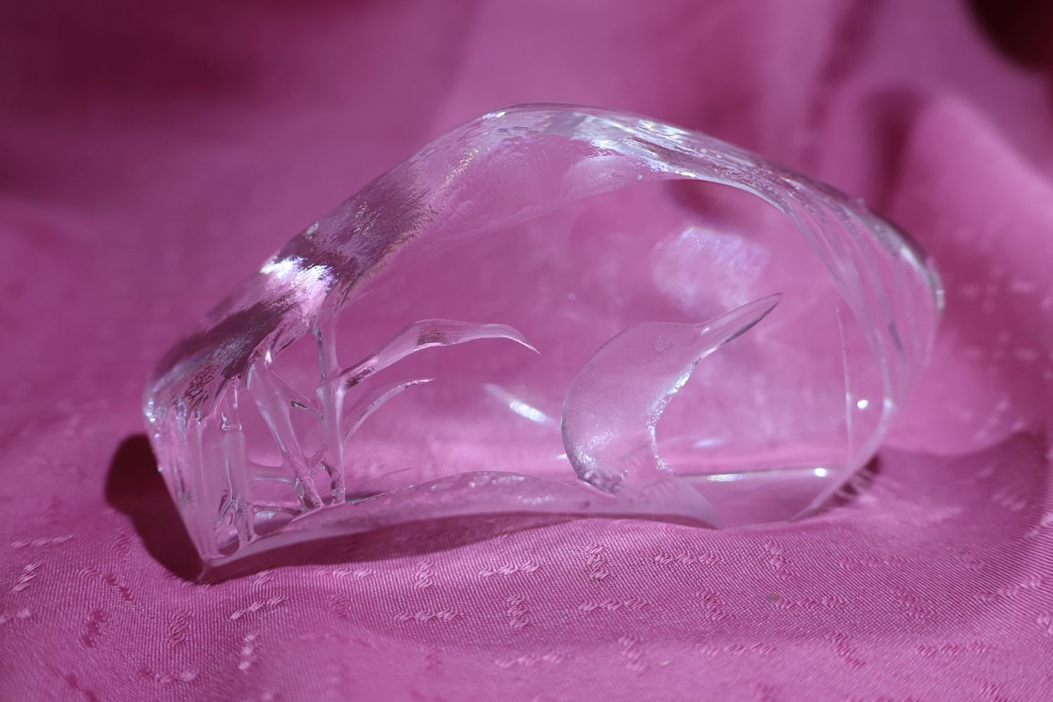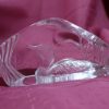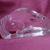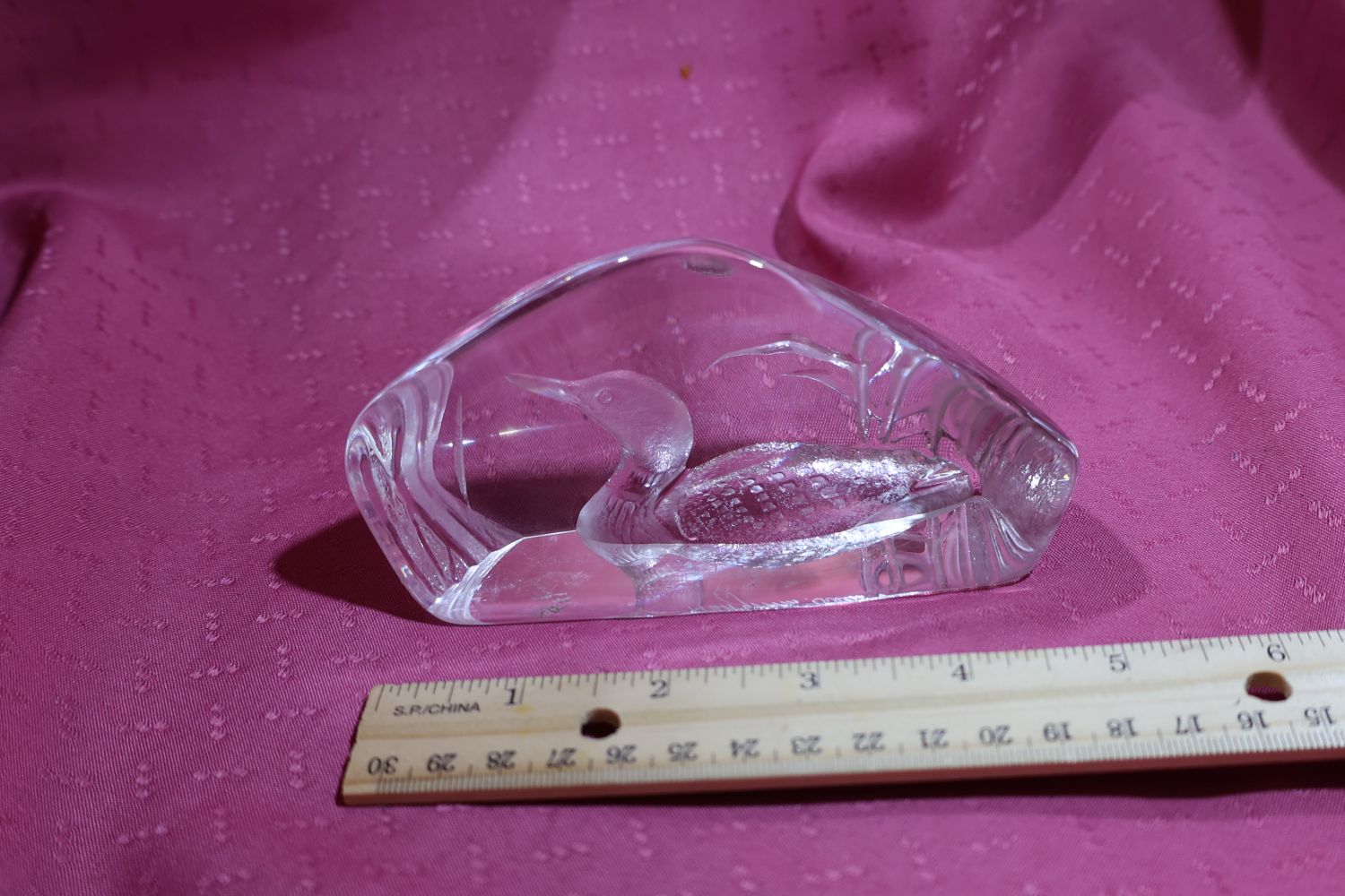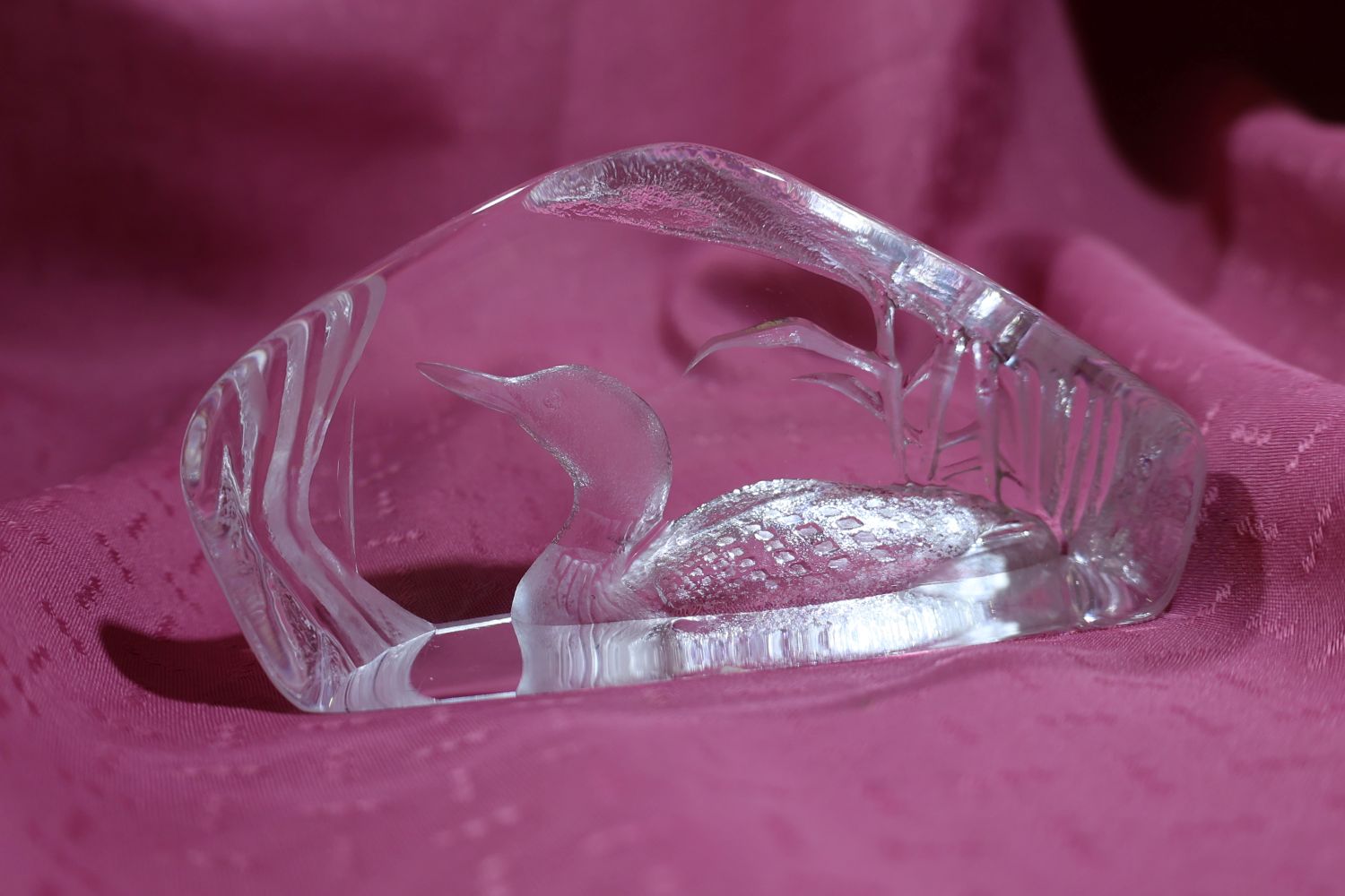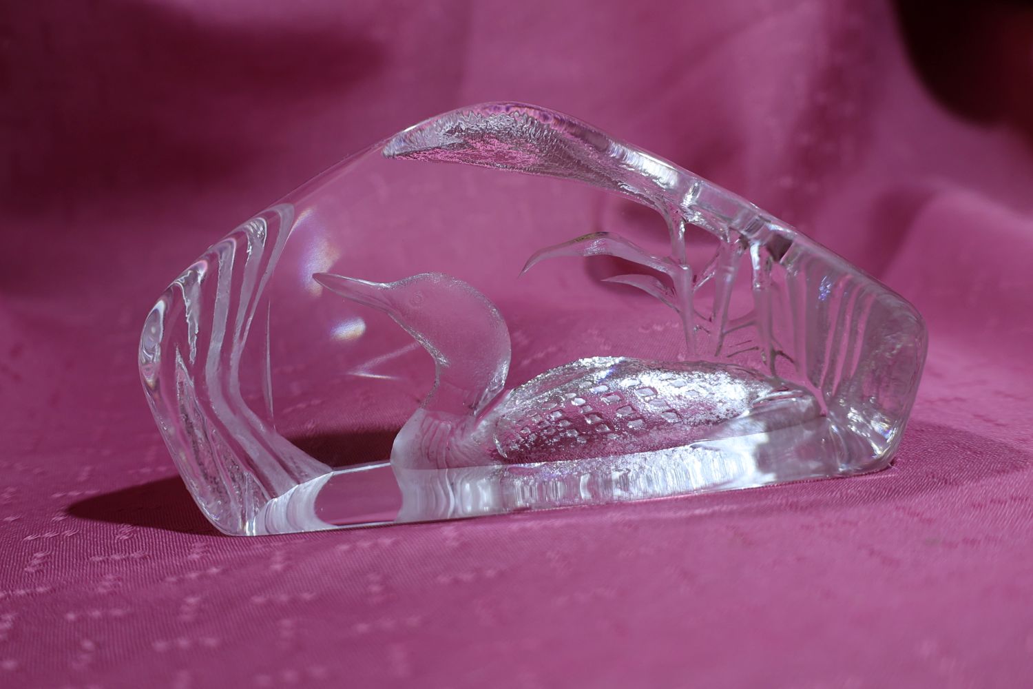 This is a Mats Jonasson crystal loon sculpture/paperweight called Peaceful Loon (33571).  It is a heavy, lead crystal sculpture made in Sweden signed and numbered.  The loon and reeds design is intricately engraved on the back side of the clear crystal block, creating a three-dimensional effect when viewed from the front.  Mats Jonasson is a renowned Swedish glass artist known for his detailed wildlife designs.