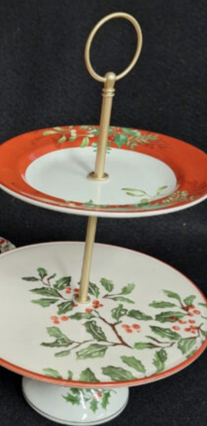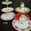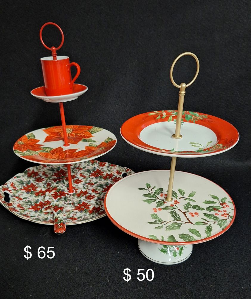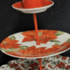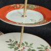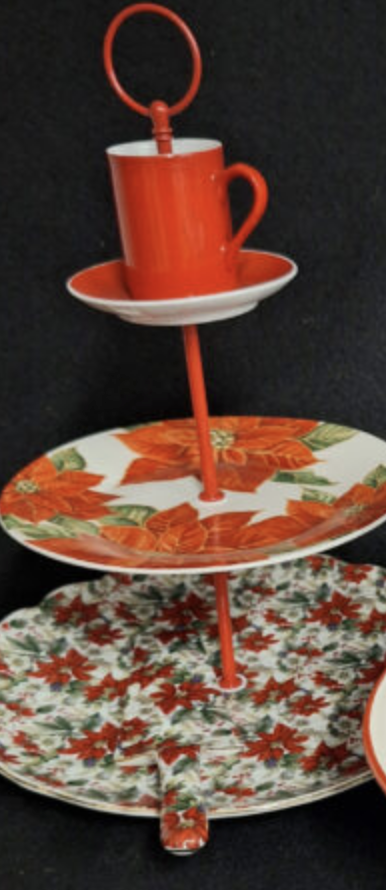Two red coloured platters to choose from. One has a red cup and saucer on top with poinsettia plates, the other has festive red and green floral patterns on the two tiers.