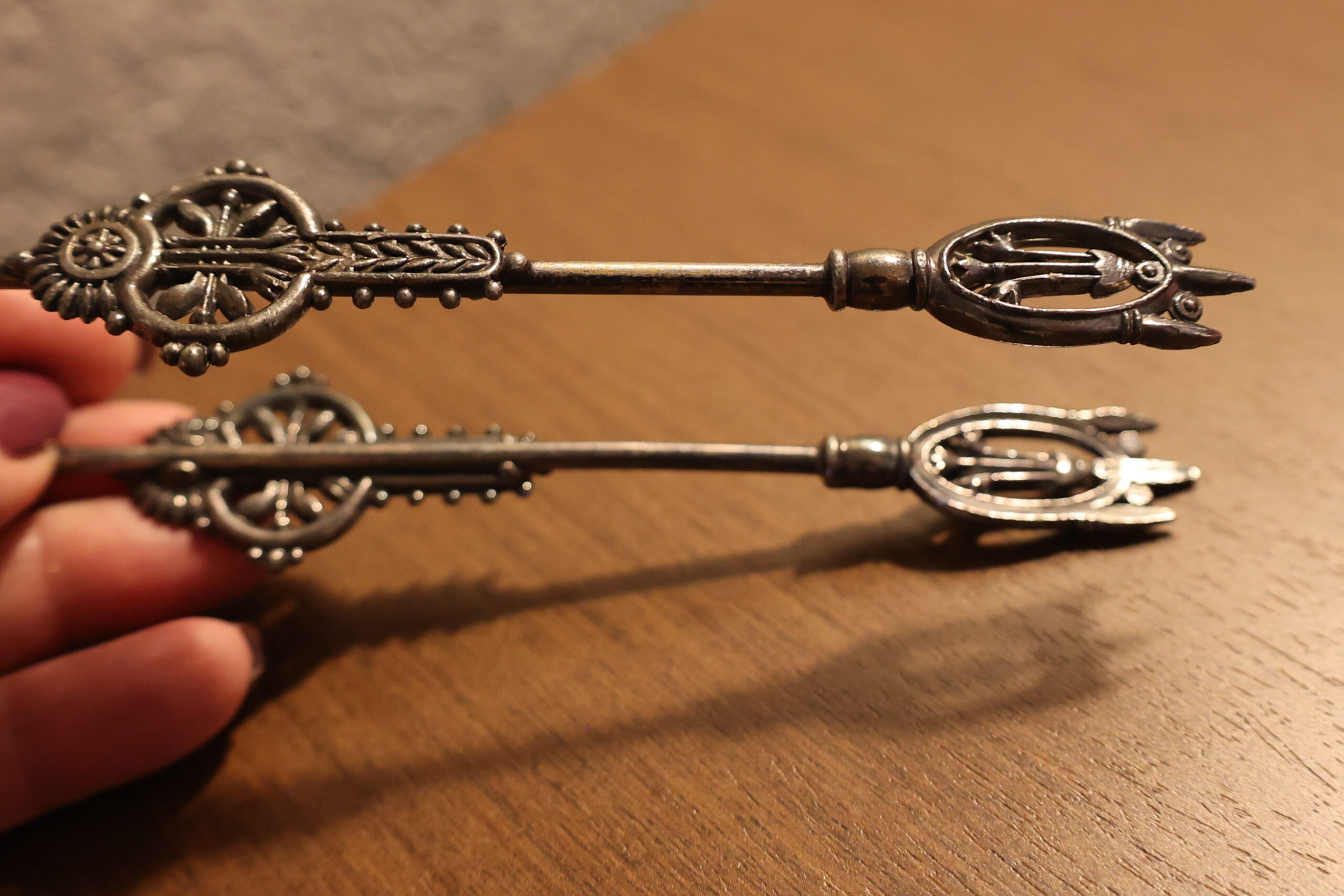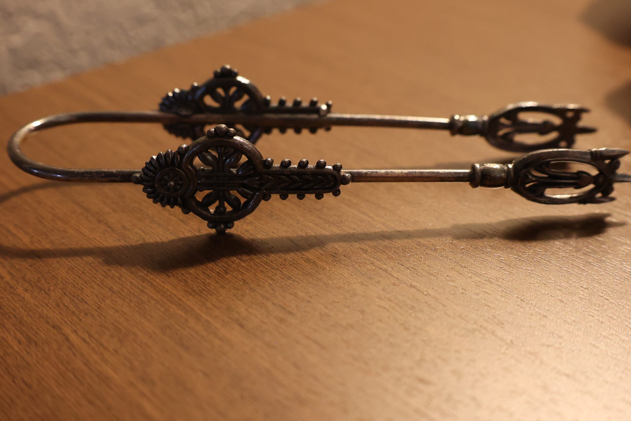 Silver plated Victorian pickle castor tongs ( could be used for small ice cubes too).  Excellent condition – no wear – probably by Meriden B. Company