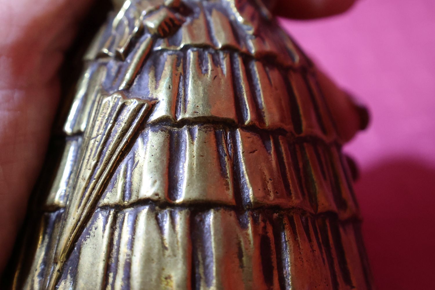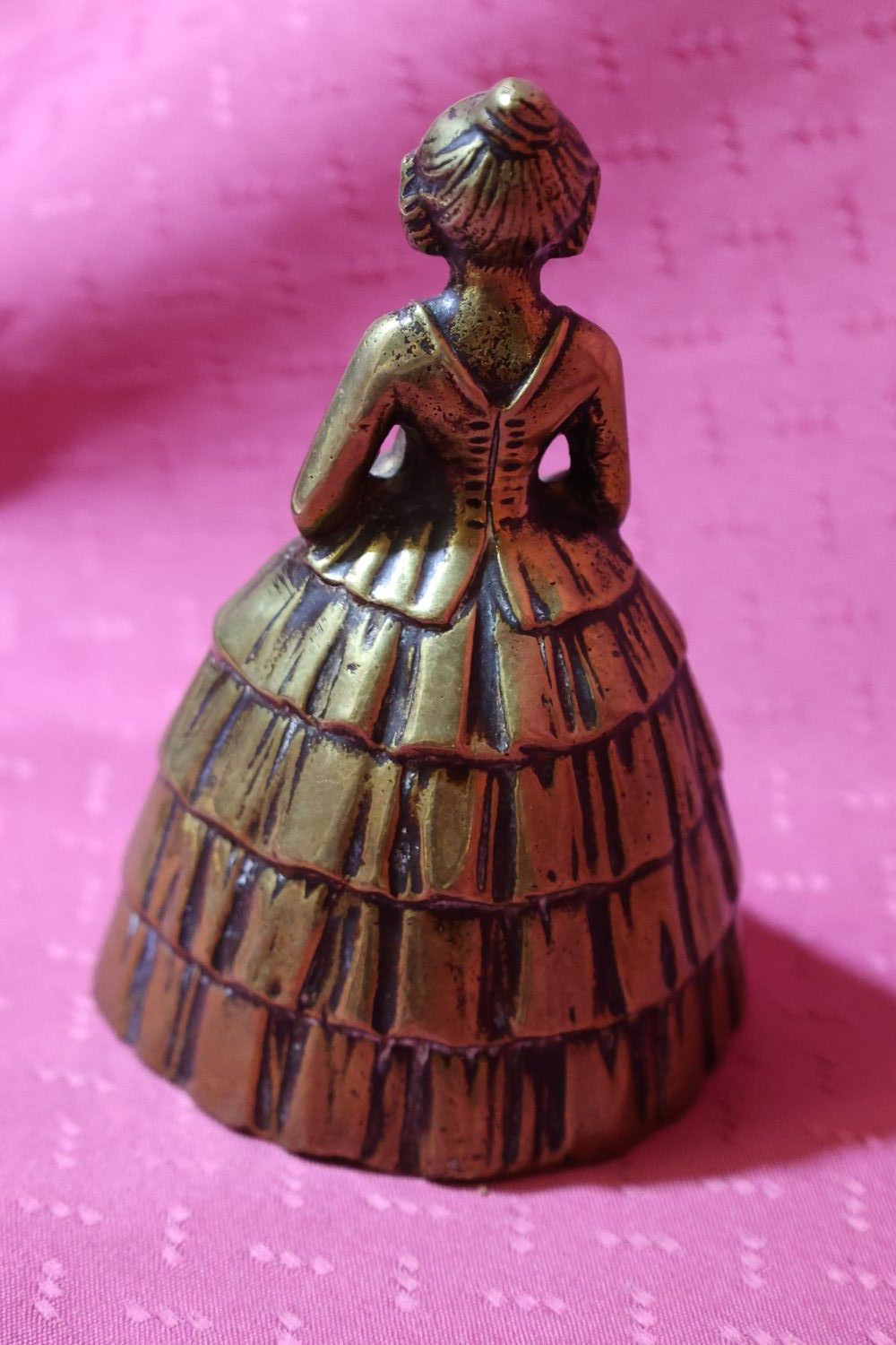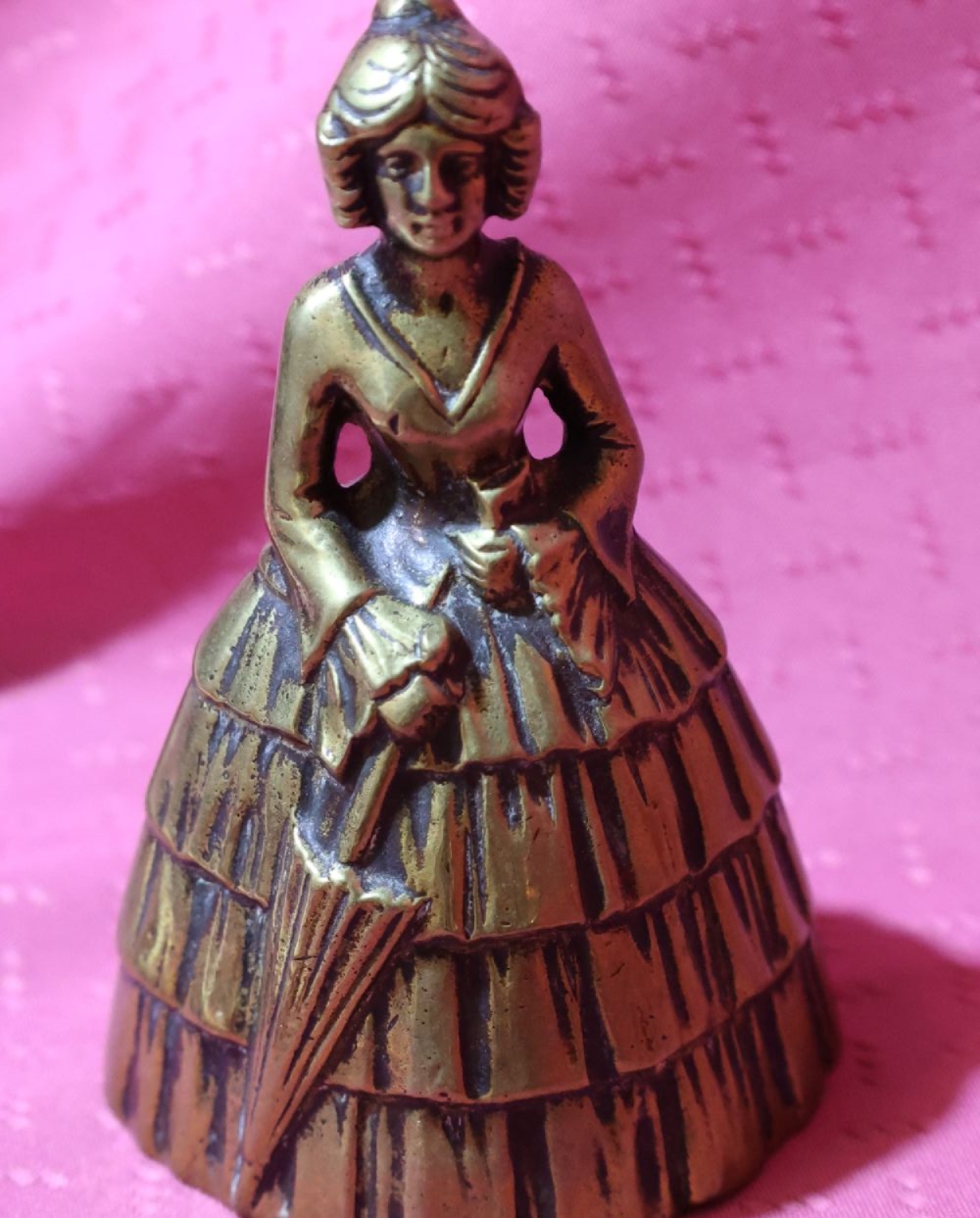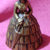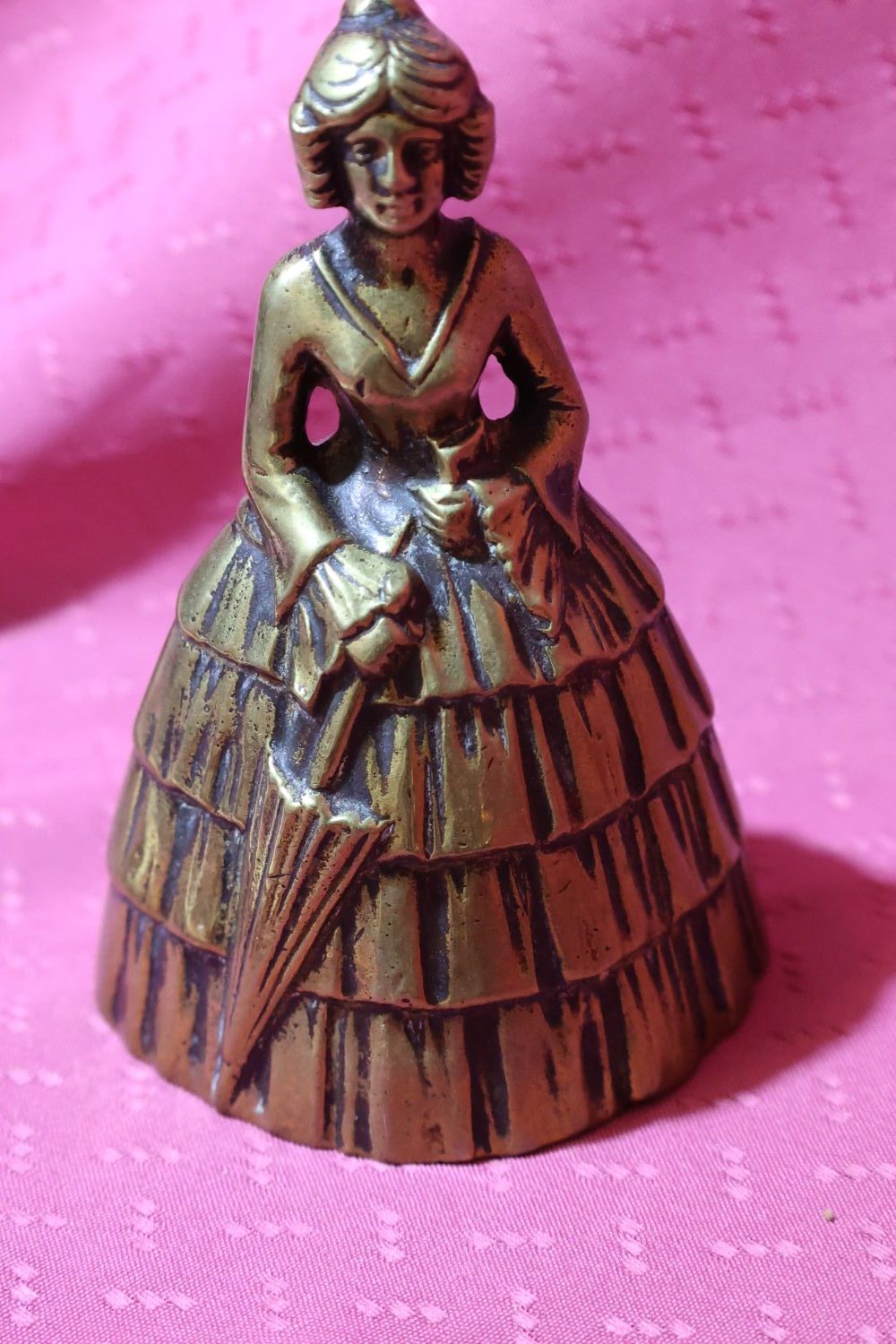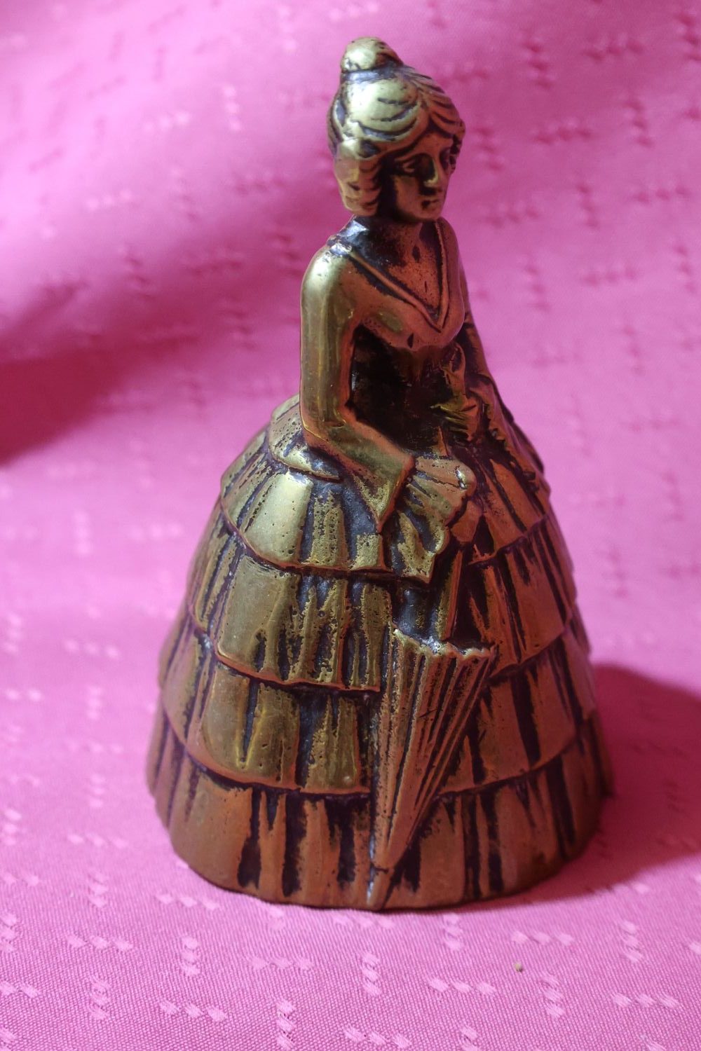 Very beautiful, antique bell or bell, lady with umbrella, made of brass. It has a charming little graceful shape. In the late 1800s, wealthy ladies called their servants and maids to them with this. It has a beautiful, high-pitched sound. Even today, it is suitable for announcing a dinner party or toasting at festive occasions. Guests will certainly appreciate such a special custom. There are no dents or damage on it, only a few signs of use.