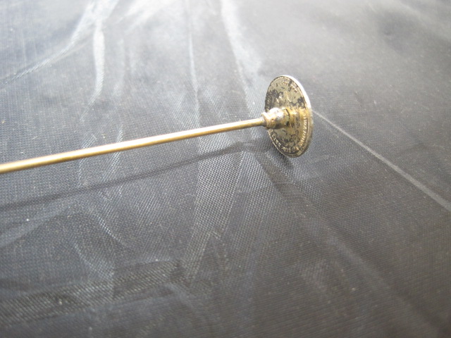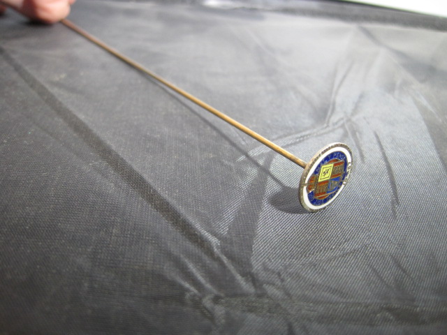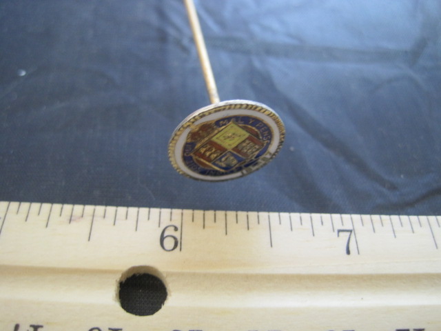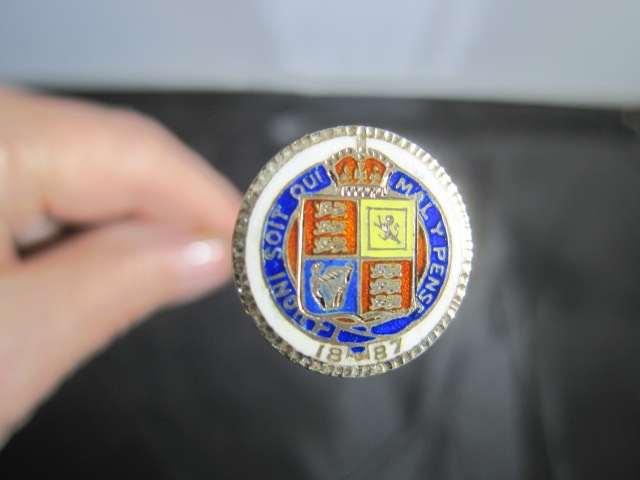 1887 Queen Victoria Jubilee One Shilling Enamel Hat Pin-  It has the shield on the front with the words “honi soit qui mal y pense” and on the back it has “Victoria Dei gratia britt regina F.D.” and the date 1887. Enamel on silver and made into a hat pin.