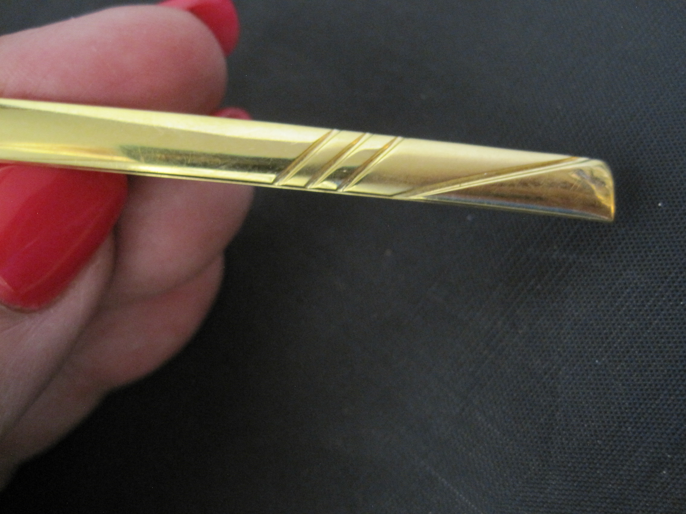 Vintage Tie clip – stamped 9 KT – weighs 5 grams of gold – has an aligator clip which was developed in the 1950s by brands like Hickok. These clips feature a hinged, spring-loaded mechanism for a stronger and more secure grip.