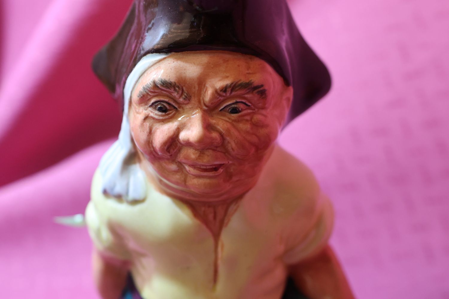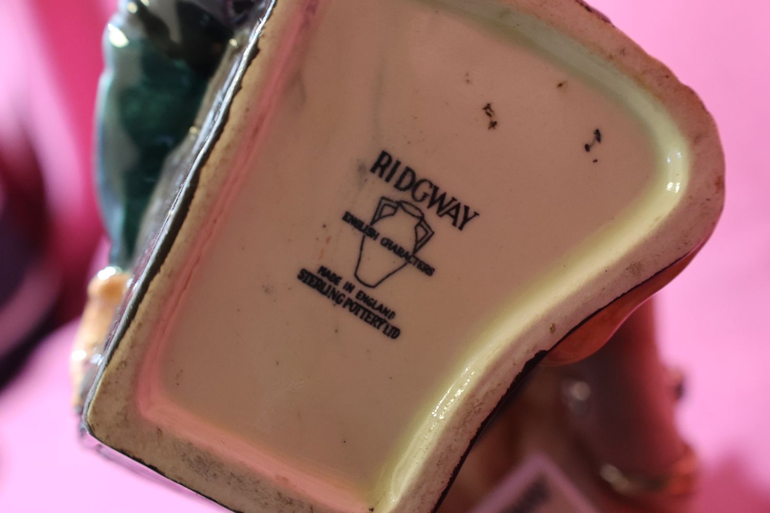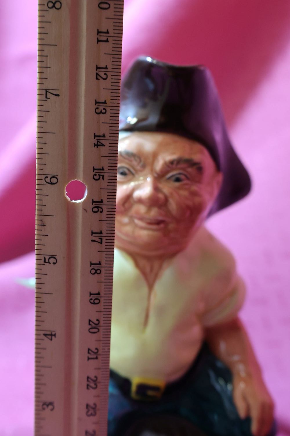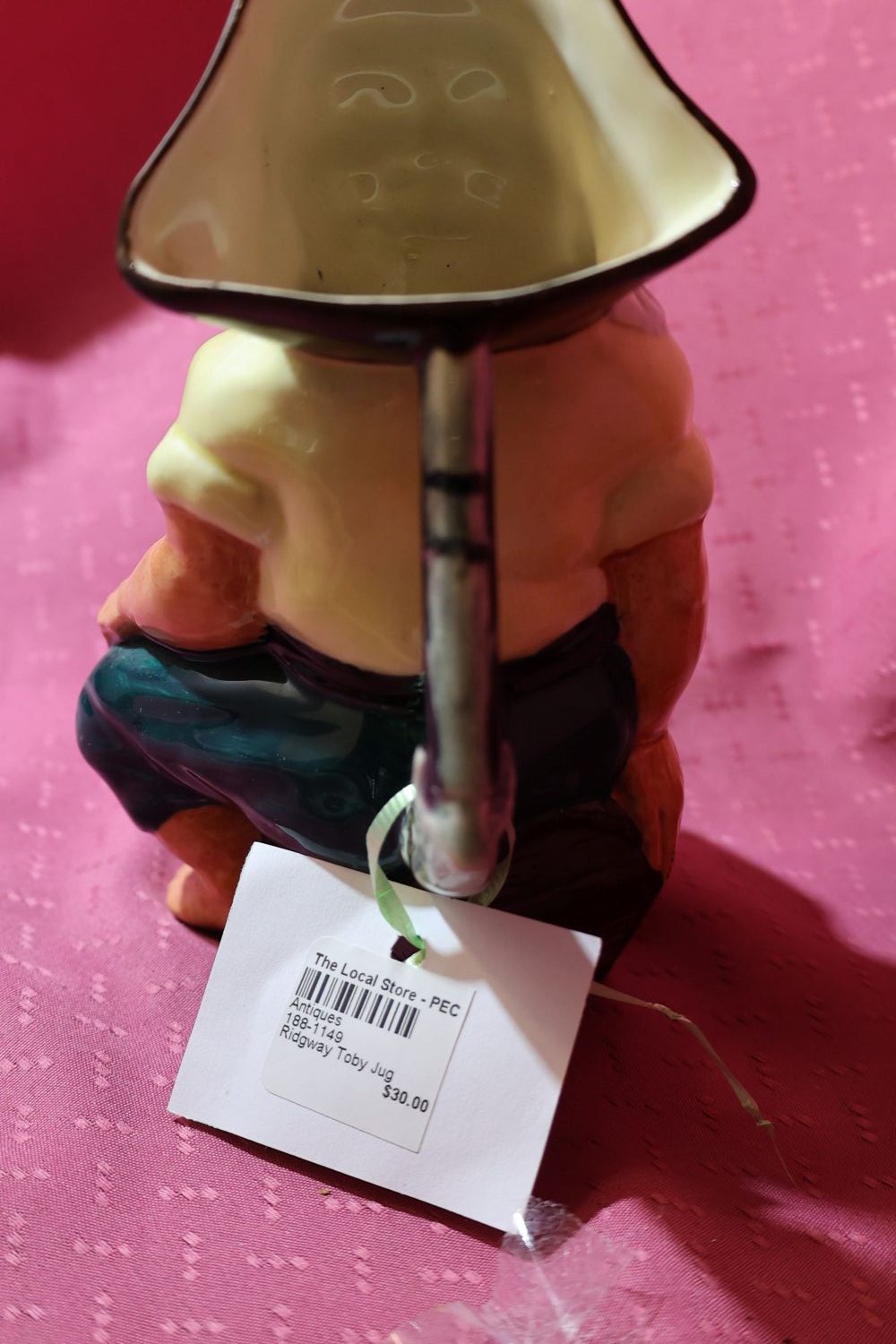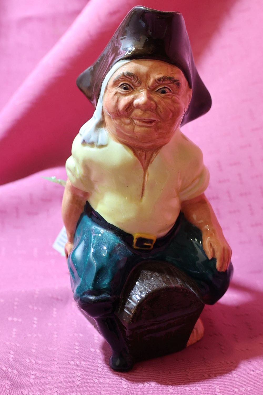 This toby jug is an English Character called Davy Jones – A pirate with a peg leg, tricorn hat and a pistol as a handle. It was made by Sterling Pottery Ltd, under the umbrella of Ridgway on Canning Street, Fenton, England between 1950 and 1953. No chips or cracks.