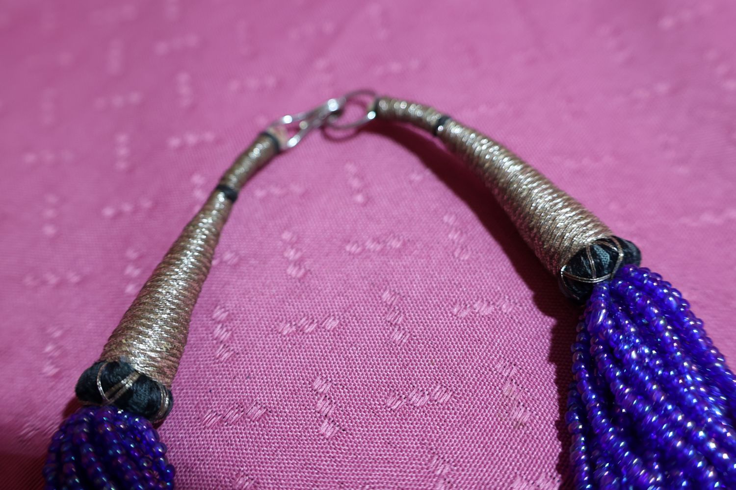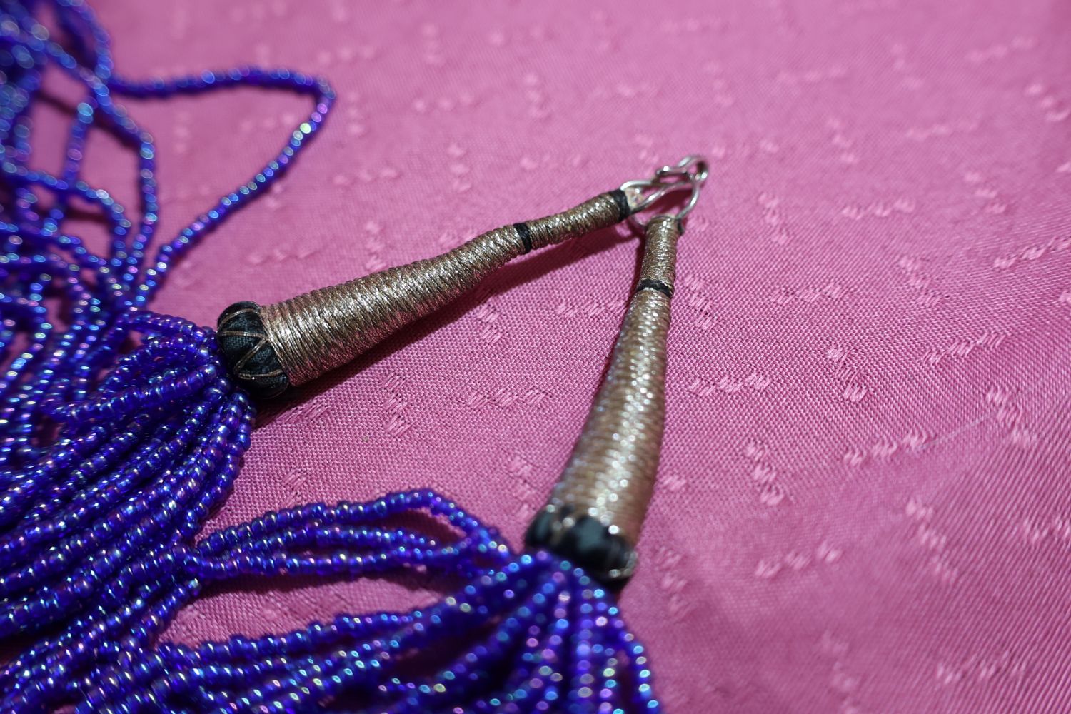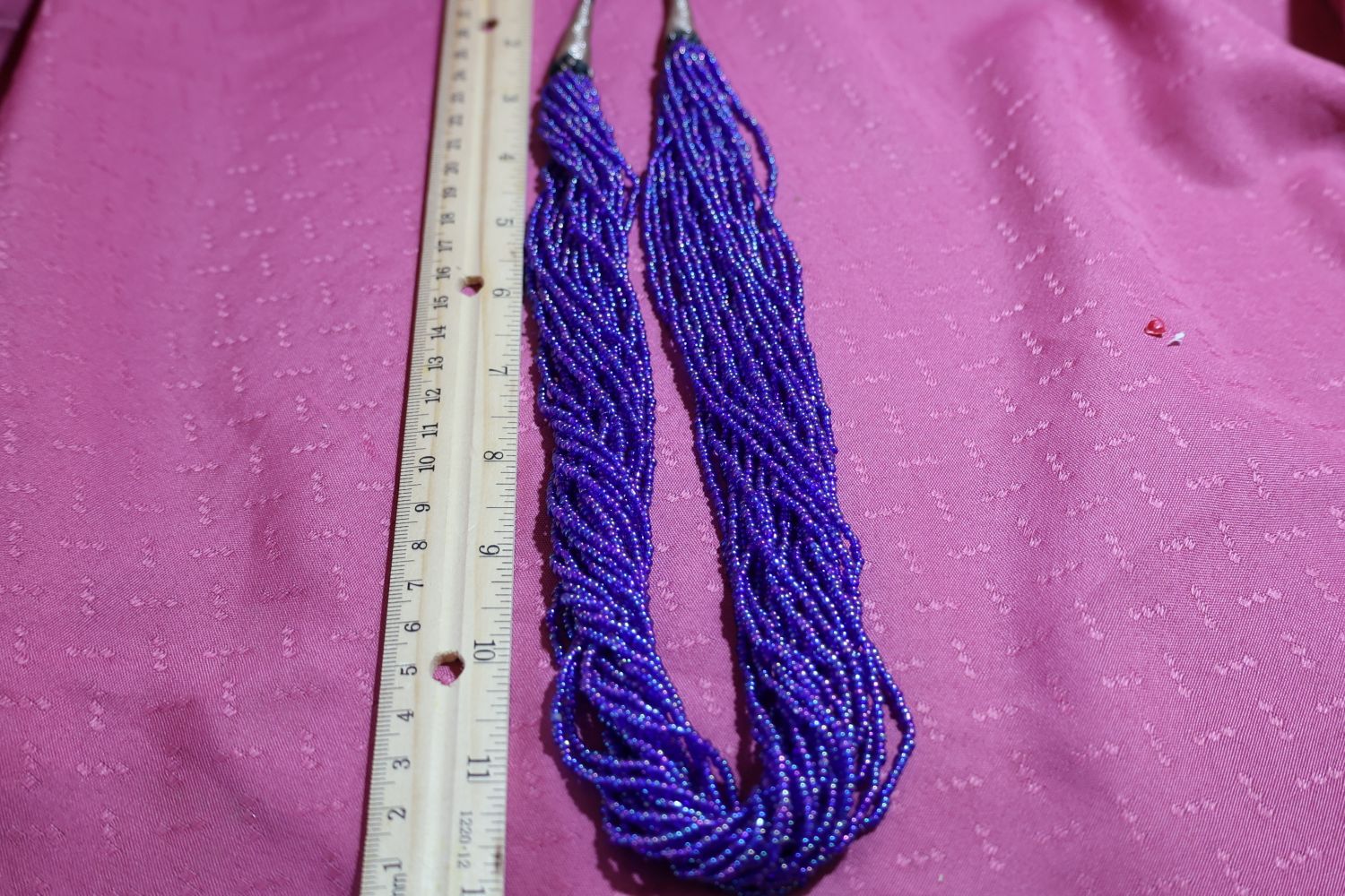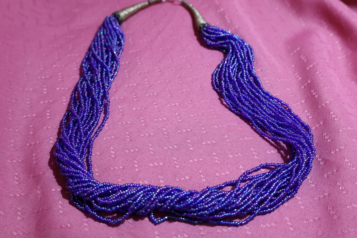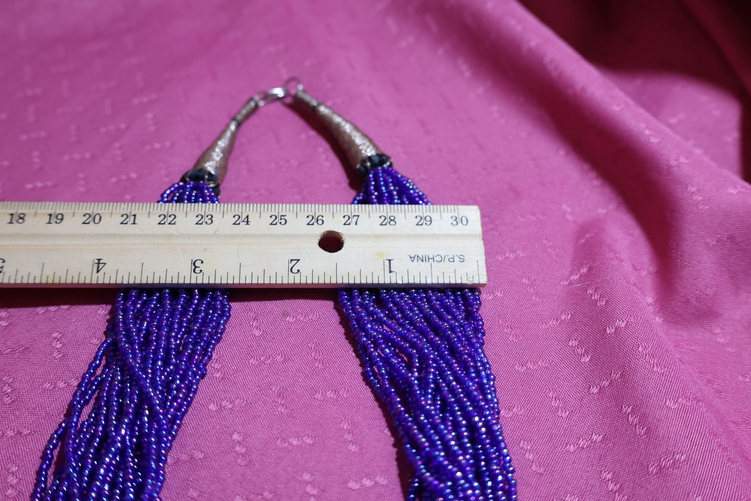 A stunning massive multi strand torsade necklace innumerable strands of iridescent royal blue glass beads converging on silver with hand woven silver thread closure as you can see from the pictures. It is in excellent vintage condition and measures 22 long by 2 inches wide. A dramatic statement torsade necklace, fashionable addition to your wardrobe!