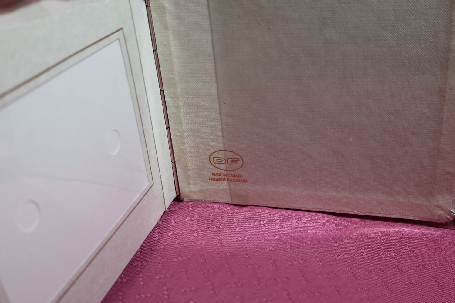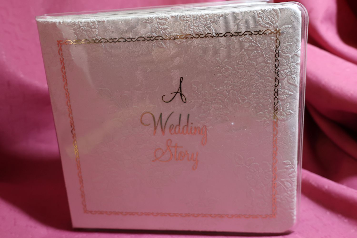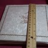 Wrapped in a heavy plastic this white brocade Wedding Photo album is a blast from the past.. This is a nice small size at about 6 inches square, probably meant to give to the parents of the couple with photos of the special day. It has never been used. The white and the pages are pristine – no writing on the first page. Made in Canada by DF company.