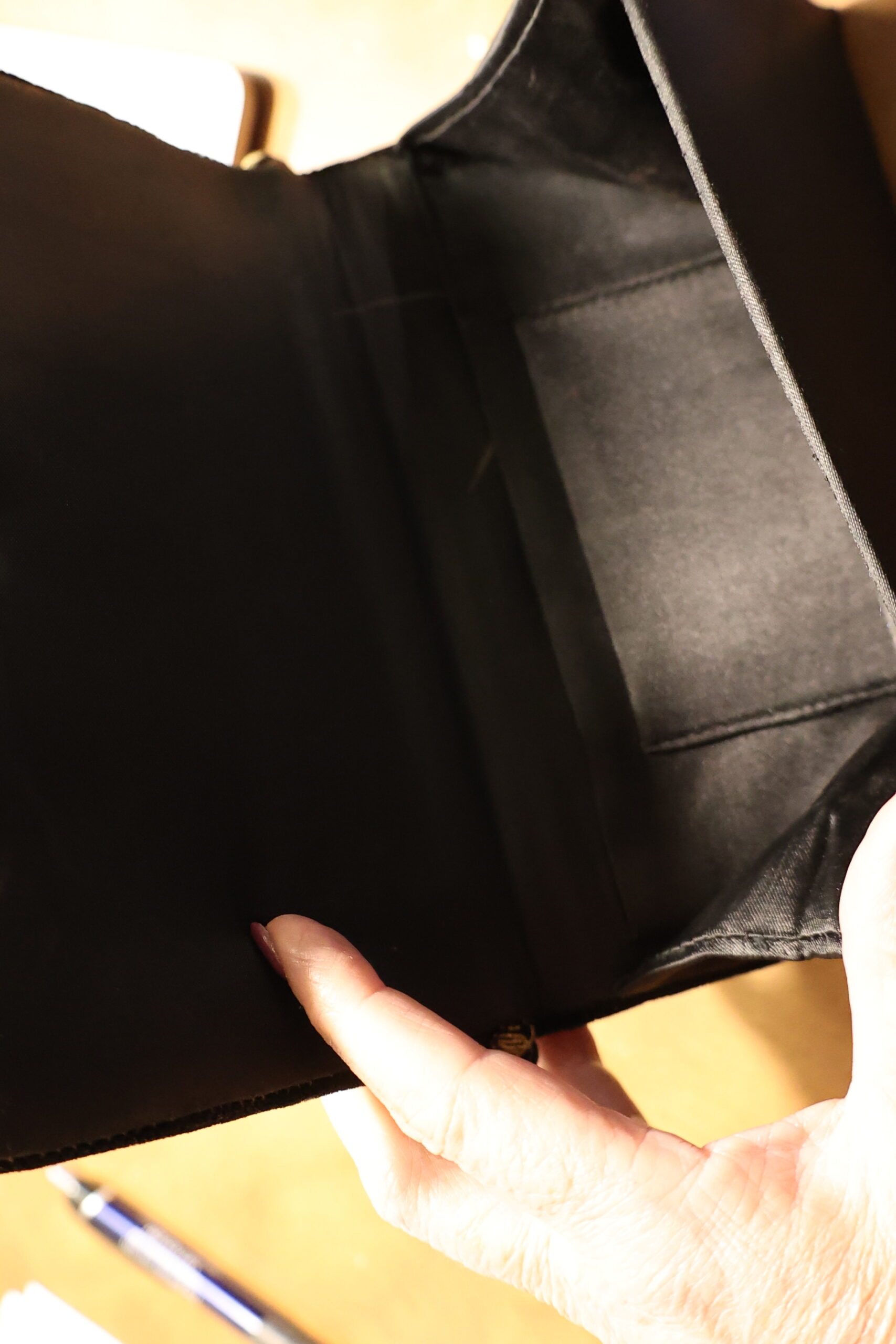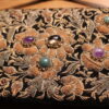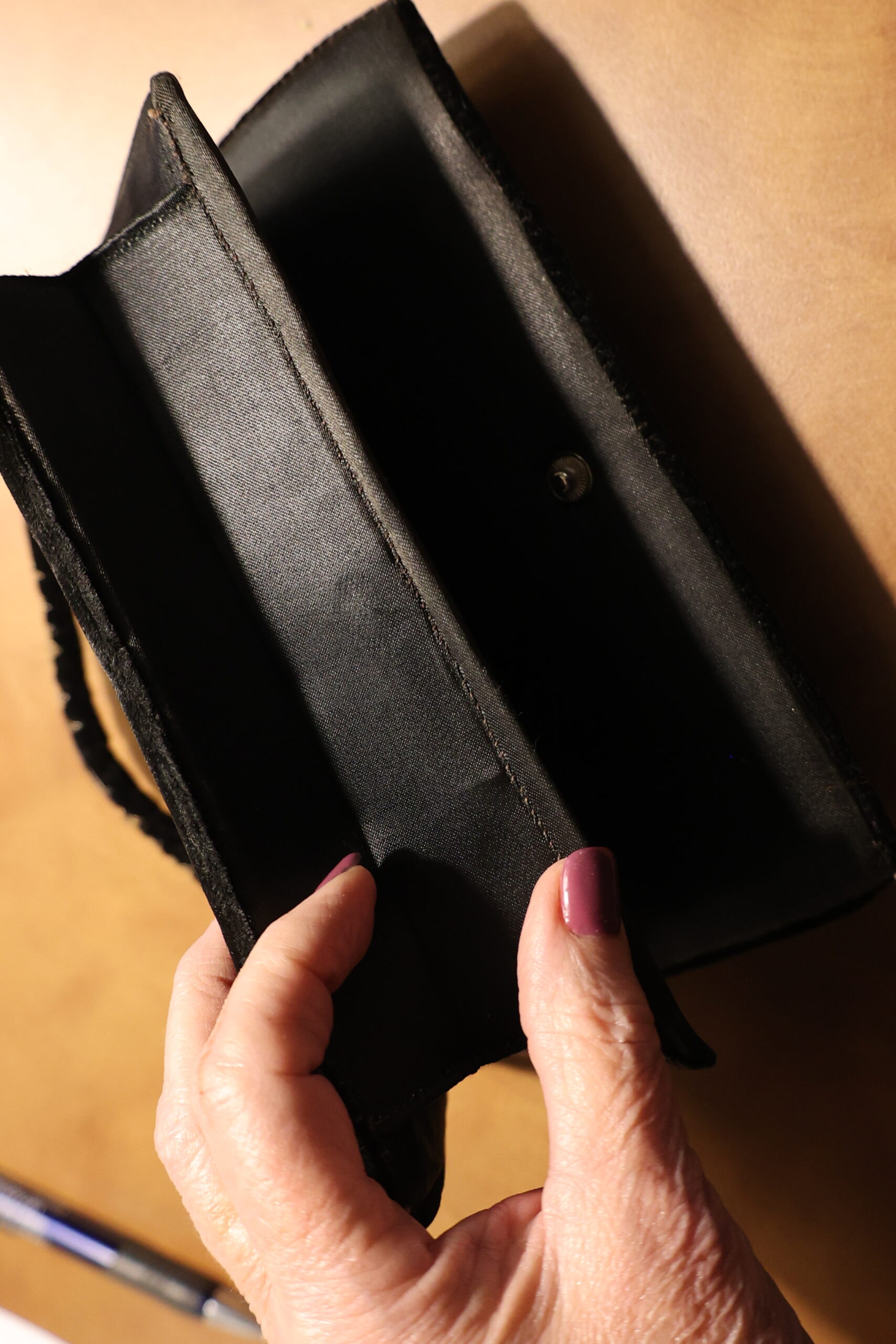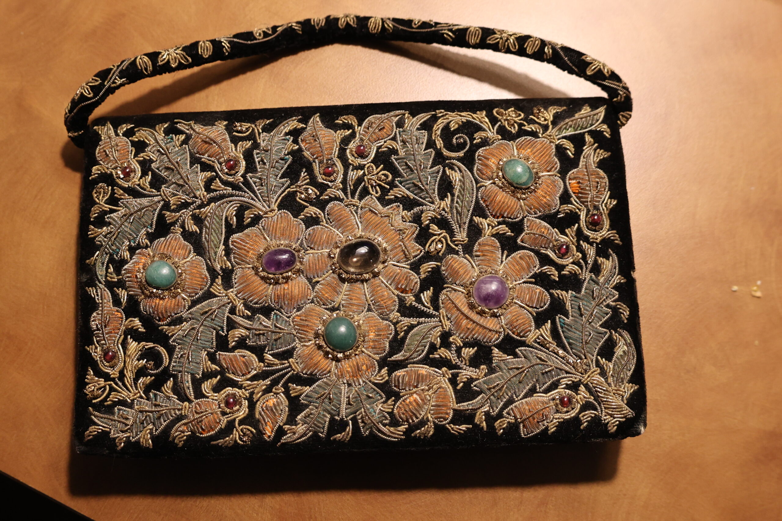 Beautifully embroidered with gold threads on black velvet with black silk lining. Embedded in multiple (6) gem stones. Excellent condition for a vintage purse with a statement!